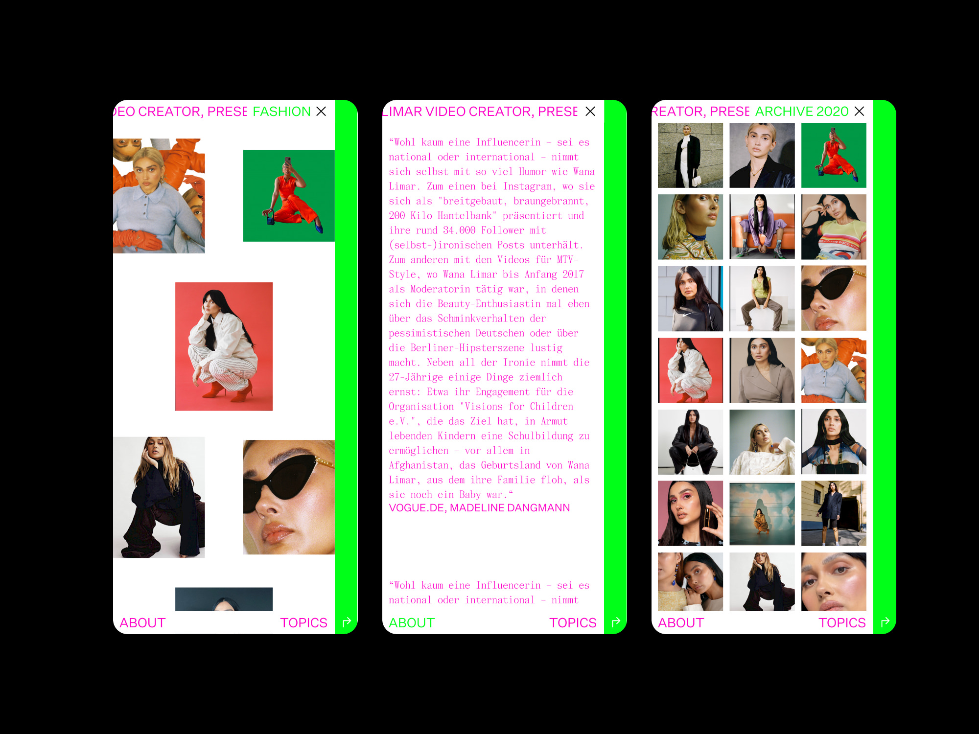 Für Wana Limar – Presenter, Video- und Content Creator – ist eine laute und unkonventionelle Website entstanden. Ihr Logo wird als animiertes und interaktives 3D-Element dargestellt. Die markante Aufteilung von Flächen in Kombination mit einer prägnanten Farbigkeit bilden die visuelle Bühne für Wanas facettenreiche Arbeitsbereiche. Diese reichen von Unterhaltung, Mode, Beauty bis hin zu ihrem sozialen Engagement und ihrem eigenen Business.